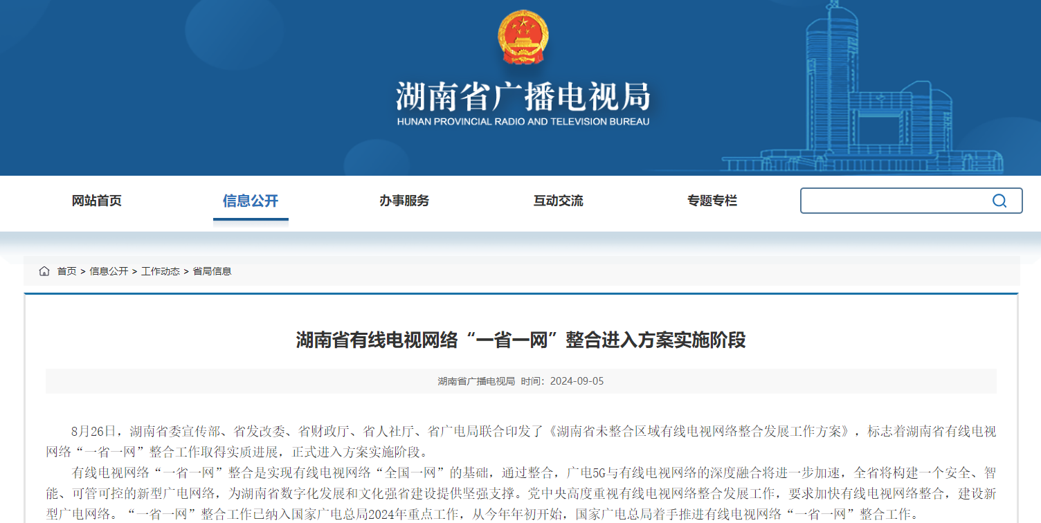 根据湖南省广播电视局9月6日的推送消息,湖南省委宣传部、省发改委、省财政厅、省人社厅、省广电局近期联合印发了《湖南省未整合区域有线电视网络整合发展工作方案》,正式确定将以中国广电湖南公司为主体,整合长沙市城区、岳阳市城区、益阳市城区、湘潭市城区及浏阳市、长沙县、湘阴县的7个未整合网络,且要确保年底前完成“一省一网”整合工作。
